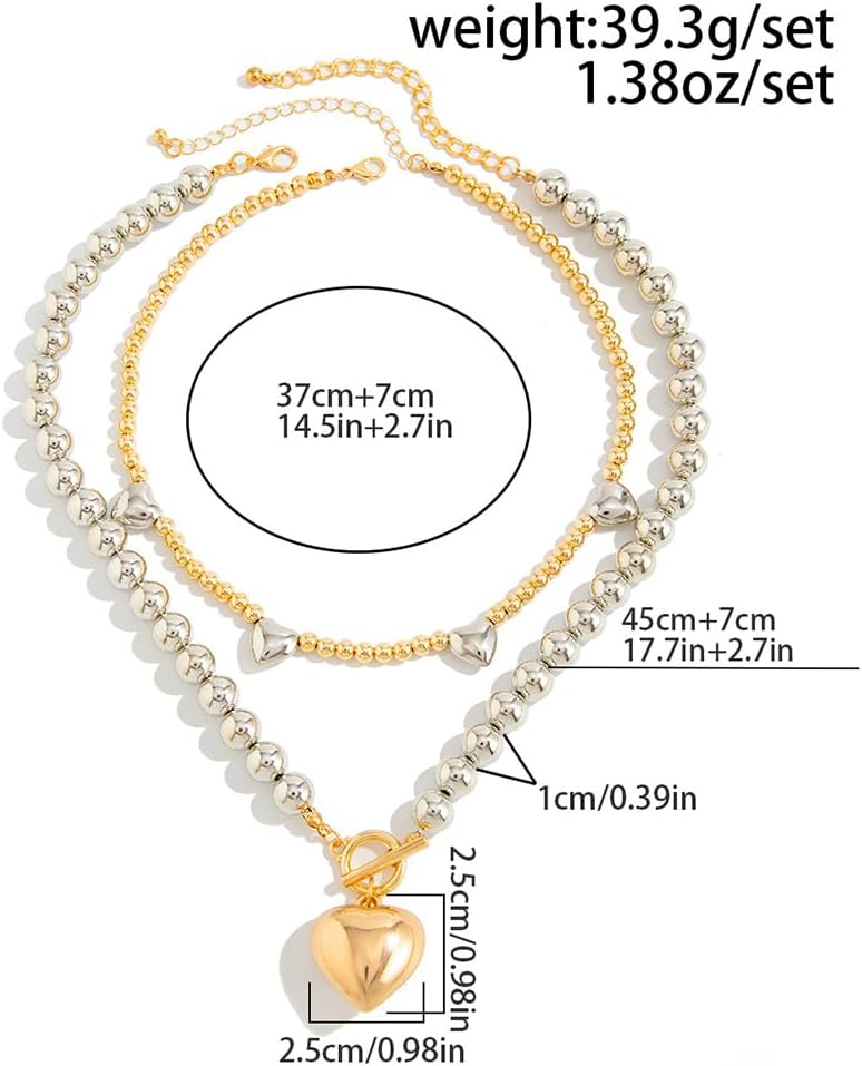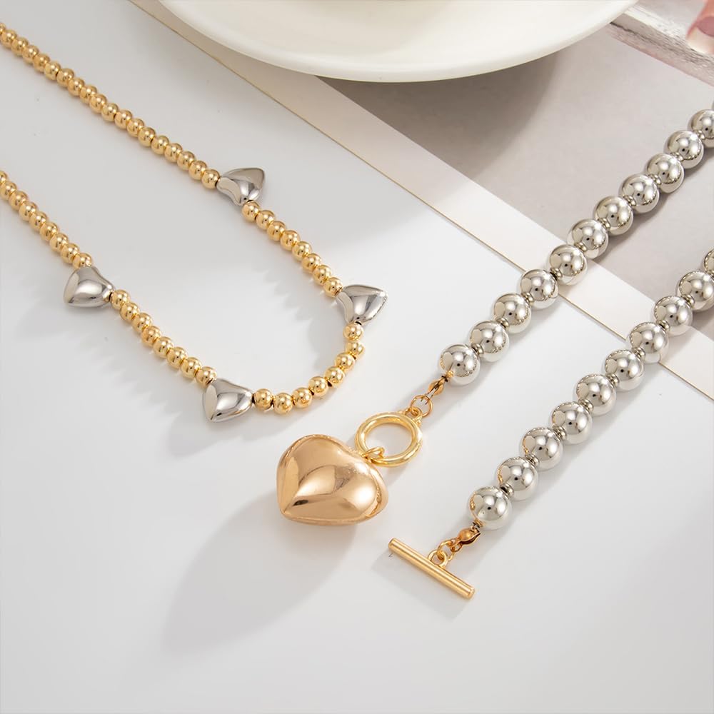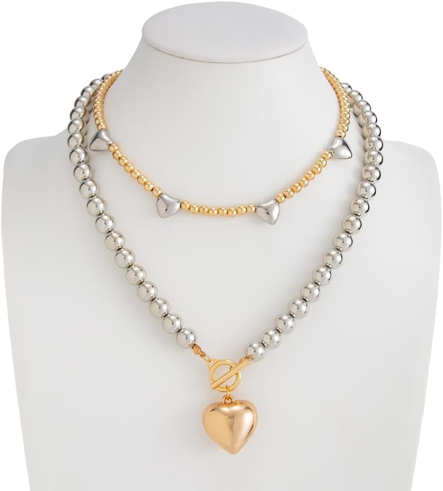 Bold Two-Tone Heart Design: Get ready to turn heads with this chunky two-tone beaded heart necklace! It features a large puffy love-shaped charm hanging from a mix of gold and silver beads for that eye-catching layered look. The cool toggle clasp isn't just functional—it adds a touch of vintage simplicity. Great for making a punk-inspired yet sweet statement