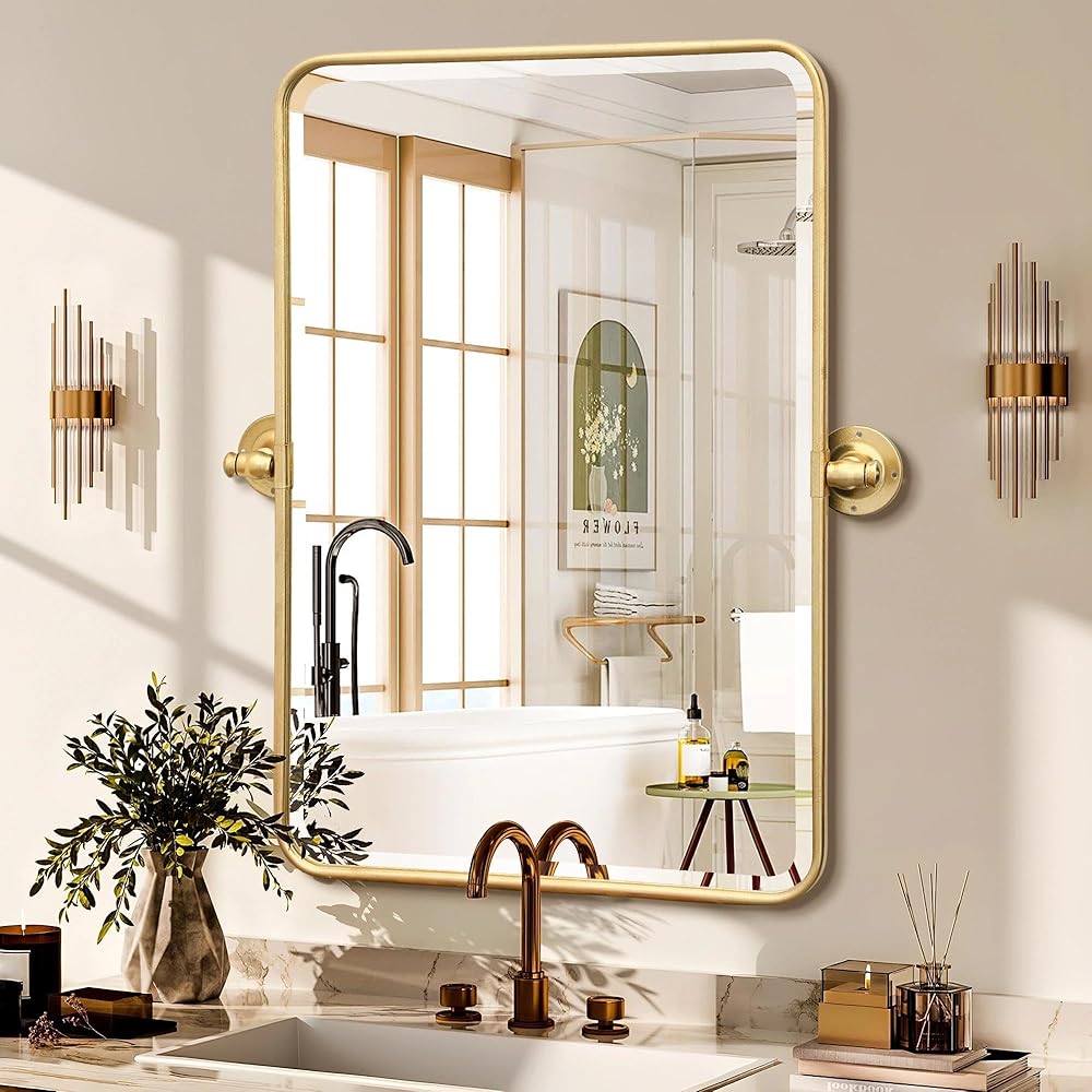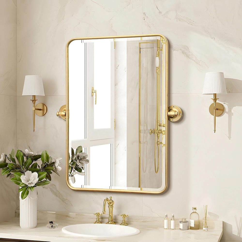 Besdomus Bathroom Gold Pivot Mirror: 20"x30" Farmhouse Beveled Tilt Vanity HD Mirror for Bathroom - Rectangular Gold Leafing Metal Framed for Horizontal/Vertical - Home Decor for Fashion-Conscious