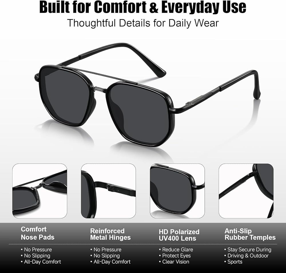 Upgrade your everyday eyewear with PRLUNVS—a modern square aviator built for crisp vision, comfort, and clean style. Clearer Vision Where It Matters The TAC polarized lenses cut distracting glare from reflective surfaces like roads, water, and glass—so you can stay focused whether you're driving, traveling, or enjoying weekend outdoors. Comfort You'll Notice (in a Good Way) With adjustable anti-slip nose pads and ergonomic temple arms, PRLUNVS is designed to sit securely without digging in—ideal for long wear during commutes, city walks, or active days. Durable Details, Everyday Ready A reinforced metal hinge provides smooth action and dependable strength for repeated use. Everything You Need—Included Each set comes with a protective case, cleaning cloth, and polarization test card—making it easy to store, clean, and confirm polarization.