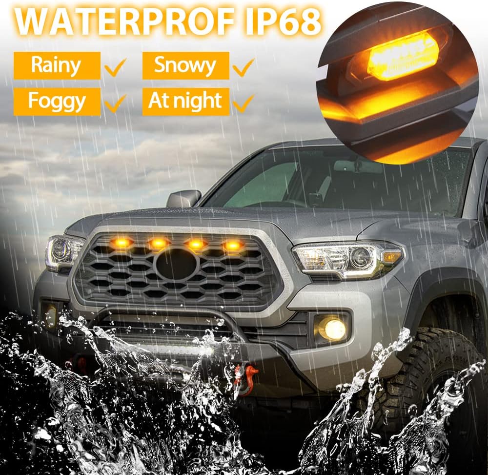 SAFETY DRIVING Upgraded waterproof of LED grill lights, your vehicle is easier to be seen in rainy/snowy or foggy weather. The amber lights make other drivers pay attention to your truck.