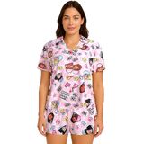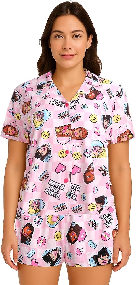 Classic Button Down Top for Stylish Lounge Sets for Women: The short sleeve, notch collar sleep shirt features a full button front and iconic Bratz design, adding a playful twist to your womens pajama sets collection. Whether you wear it open over a tank or buttoned up, this versatile top works for sleep and chill time alike.