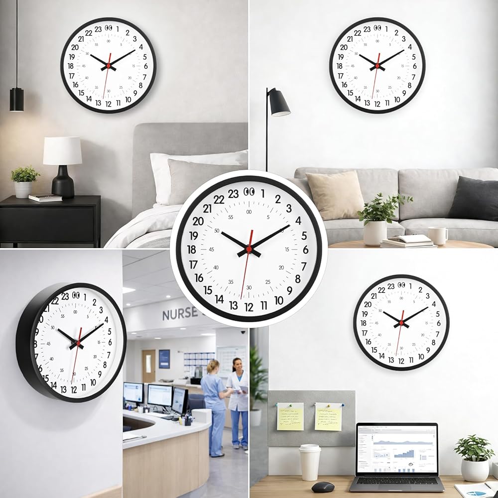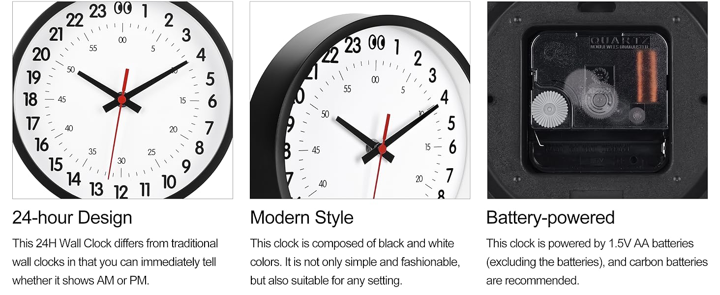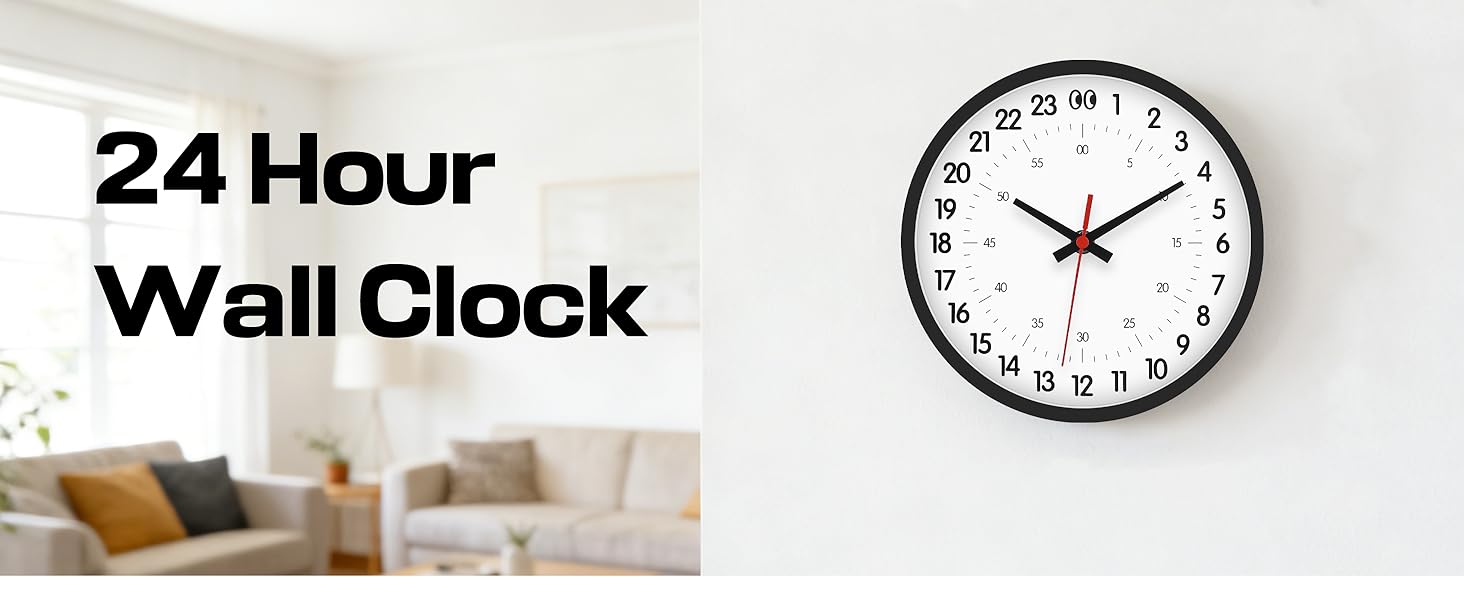 𝐔𝐧𝐢𝐪𝐮𝐞 𝟐𝟒-𝐇𝐨𝐮𝐫 𝐃𝐢𝐬𝐩𝐥𝐚𝐲 - Say goodbye to the traditional 12-hour format. This 8 inch wall clock modern features a clear 24-hour system, with outer ring numbers 1-24 representing hours and inner ring numbers 0-60 indicating minutes and seconds. The design of this 24 hour analog clock offers excellent readability, allowing you to instantly distinguish AM from PM and plan your schedule more efficiently.