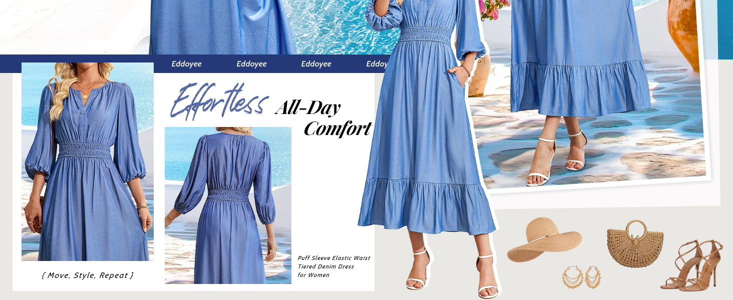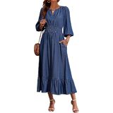 Feature: Drapy, smooth & denim-look fabric. Notched V neckline, 3/4 lantern sleeve, side hidden pockets, empire smocked waistband, tiered flowy hem, A line silhouette, elegant maxi length.
