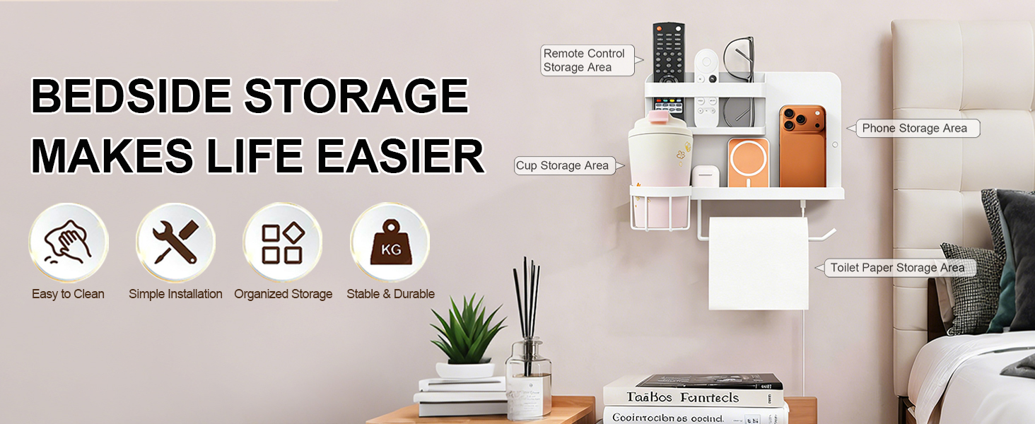 【No Drill Bedside Organizer - Damage-Free Installation】:No drilling tools required. Easily secure to the wall using strong adhesive tape or screws. Perfectly compatible with bedhead storage racks and overbed shelves. Ideal for apartments, rental homes, and dormitories, protecting your walls from damage. An ideal choice for bedside wall shelves and wall nightstands.