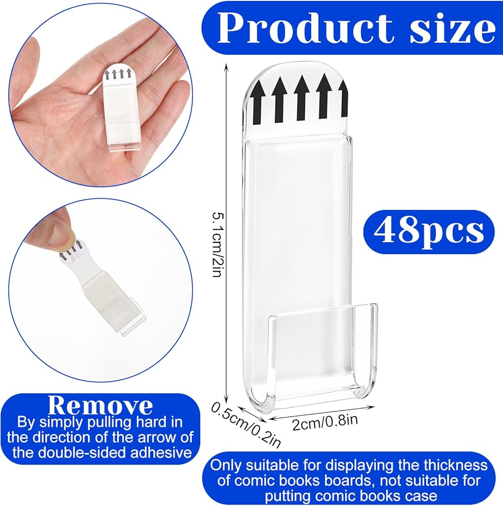 Package Contents: You will receive 48 pcs comic book wall display, accommodating any collectible no thicker than 0.2 inches (approximately 5 mm). These bookshelves take up minimal space and are perfect for standard-sized comic books and all kinds of vinyl records.