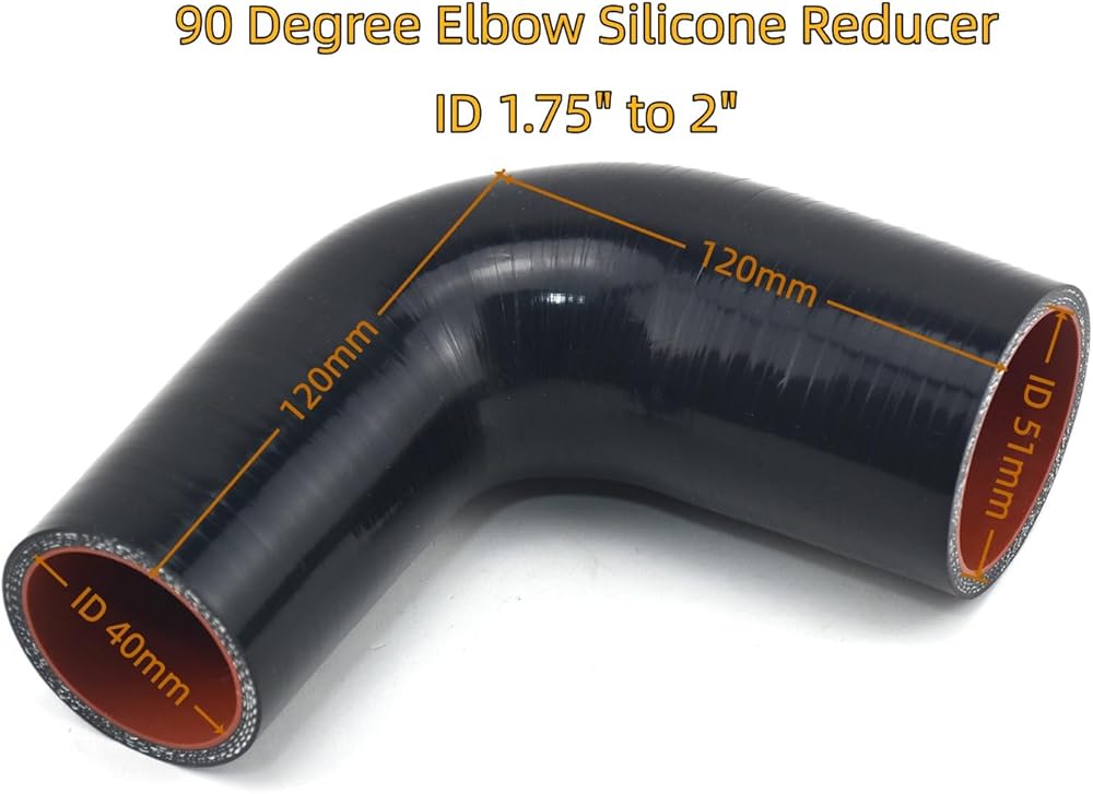 ID 1.75" to 2" (45mm to 51mm) 90 Degree Elbow Silicone Reducer, Leg Length 4.7" (120mm), Automotive General Reinforced 4-layer High Performance Coupler Connector With Clamp