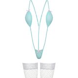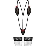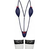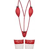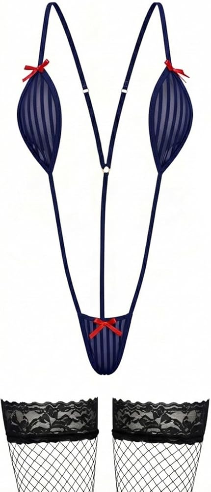 Designed for the bold and self-assured woman, this provocative ensemble features an ultra-revealing micro bikini paired with matching fishnet stockings. It's crafted to turn heads and ensure all eyes are on you, making a statement of undeniable allure.