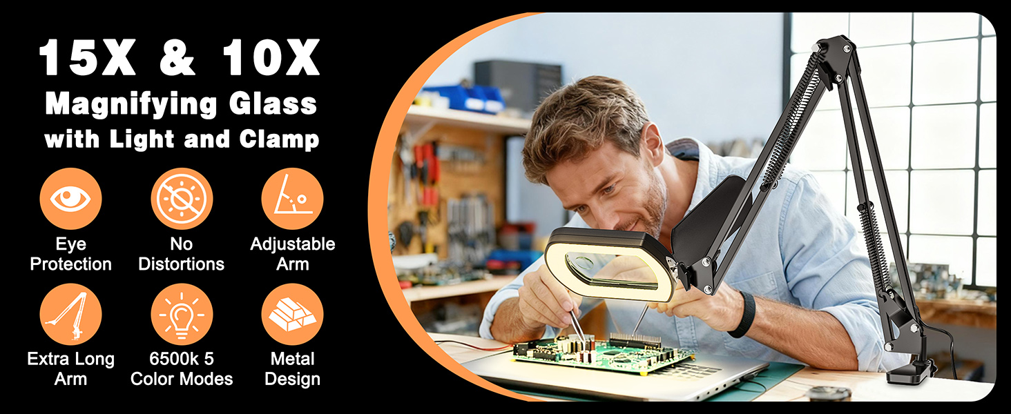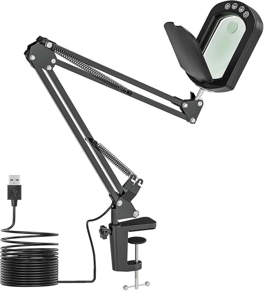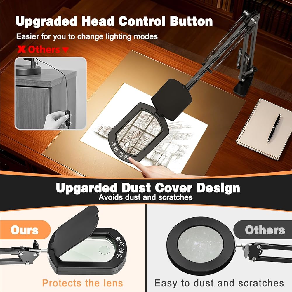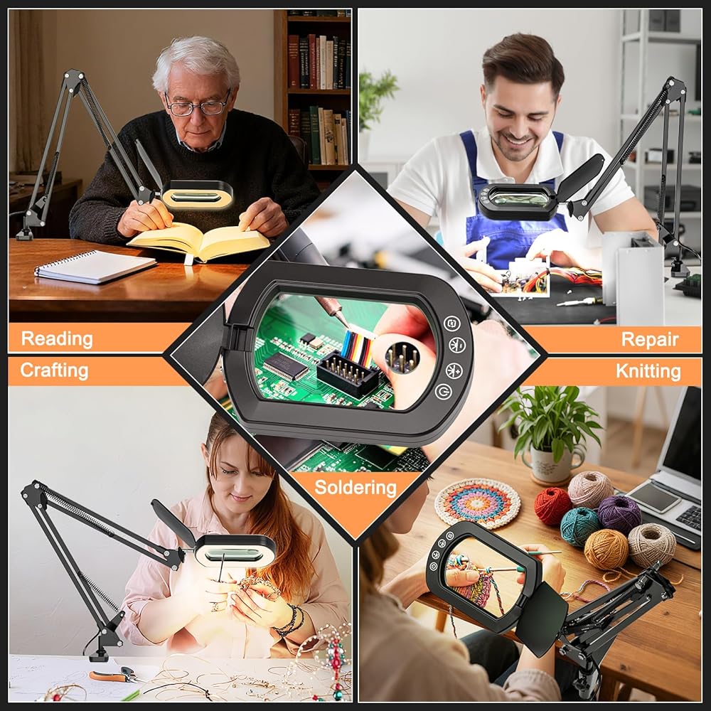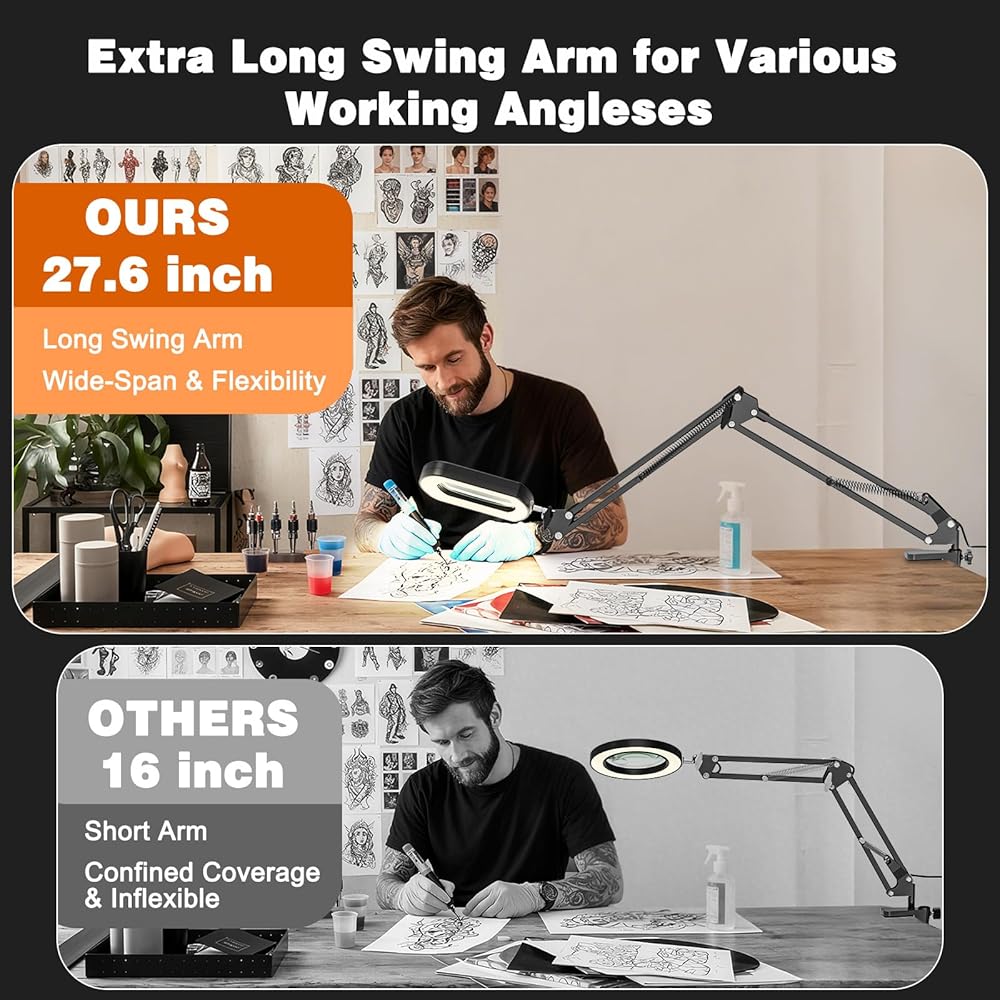 The 27.6" Arm That Actually Holds Still: Never force a shaky magnifier again. Our heavy-duty aluminum arm extends 50% longer (27.6") than standard arms, yet locks rock-solid at any angle. The glass lens can be adjusted 225 degrees up and down, and 360° whirl. The swivel arm can be adjusted up and down and rotated 360 degrees, so you can position the lens exactly where you need it for hands-free work, whether you're repairing a watch or painting miniatures. No drift, no vibrations.