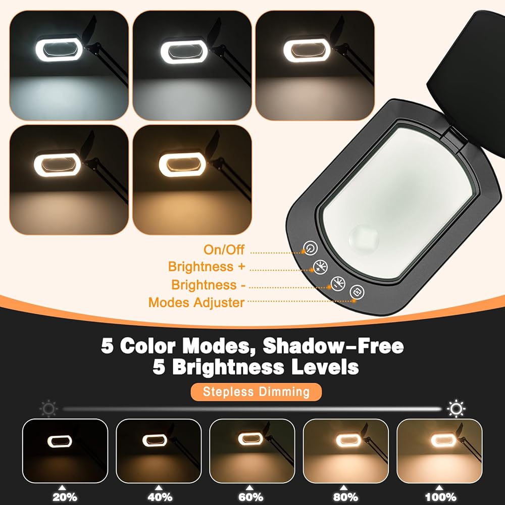 84 LEDs & Stepless Dimming: Studio-Grade Lighting, Anywhere. Our 84 LED array creates perfectly even, shadow-free brightness—like a professional studio lamp. Unlike basic 3-mode lights, we offer 5 color temperatures plus true stepless dimming. Dial from a soft 10% glow for midnight reading to 100% daylight for repairing the tiniest smartphone parts.