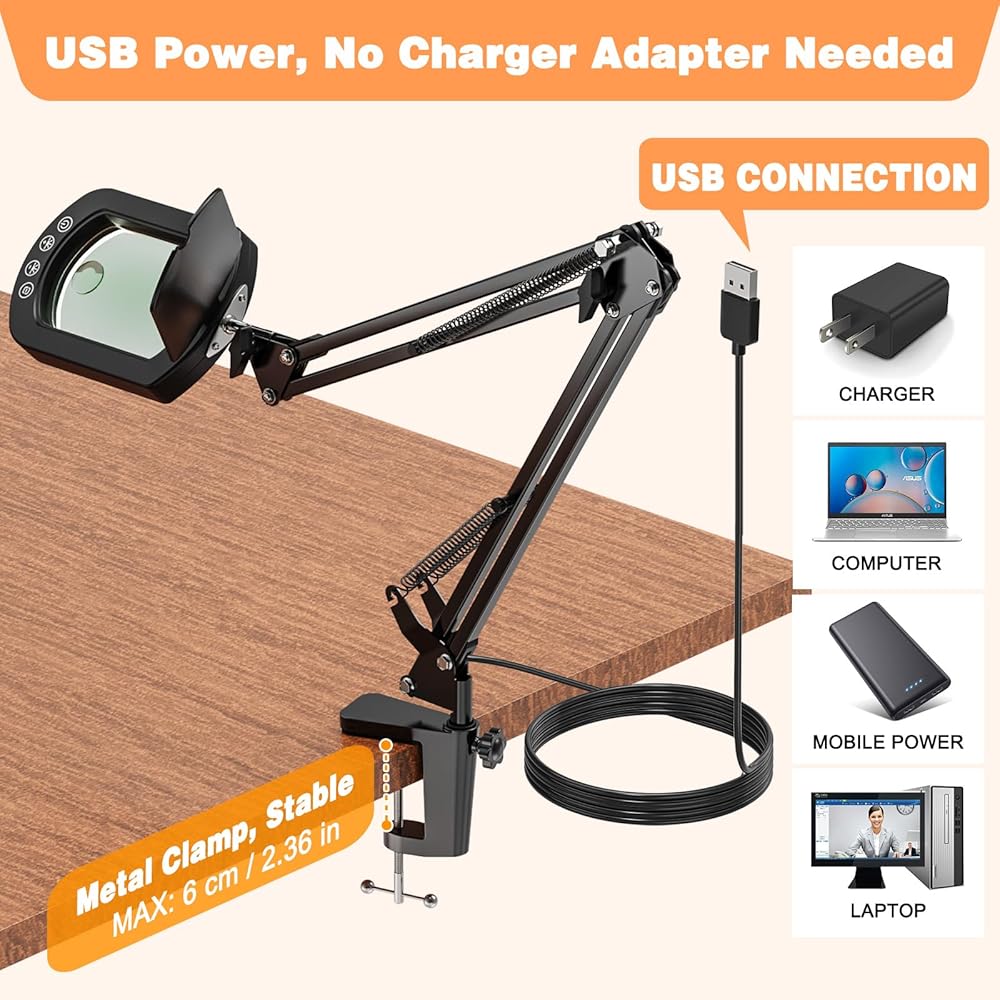 Clamp & Go: Set Up in 10 Seconds, Power Anywhere: No tools, no outlets, no hassle. Clip it securely to any surface up to 2.36" thick in under 10 seconds. The long 43" USB cable plugs into your laptop, power bank, or car adapter—making it your go-to portable workstation for home, office, or on-site repairs. Free your hands and your workspace.