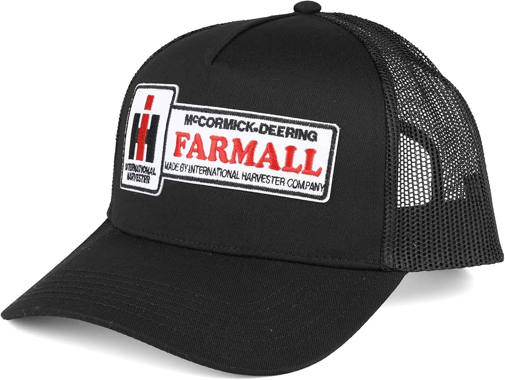 Trucker style black mesh hat displaying the IH McCormick-Deering Farmall logo.