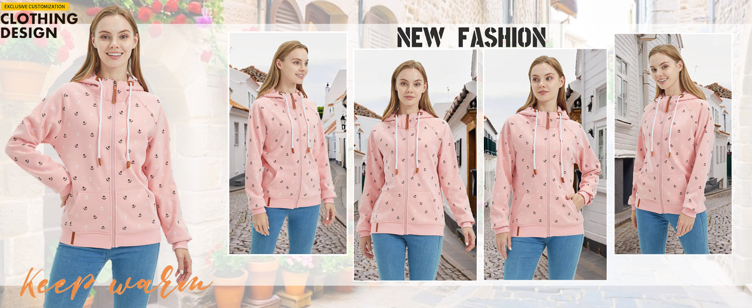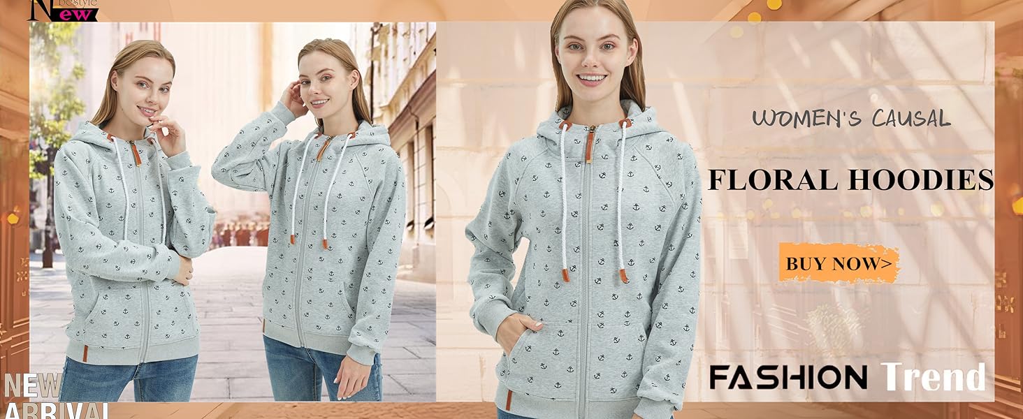 - Features: Long Sleeve, Floral Print,Full Zipper, Hooded with Drawstring,Kanga Pocket