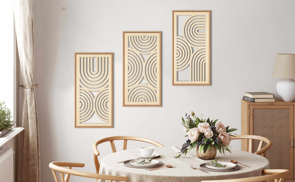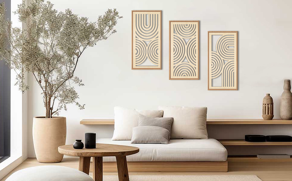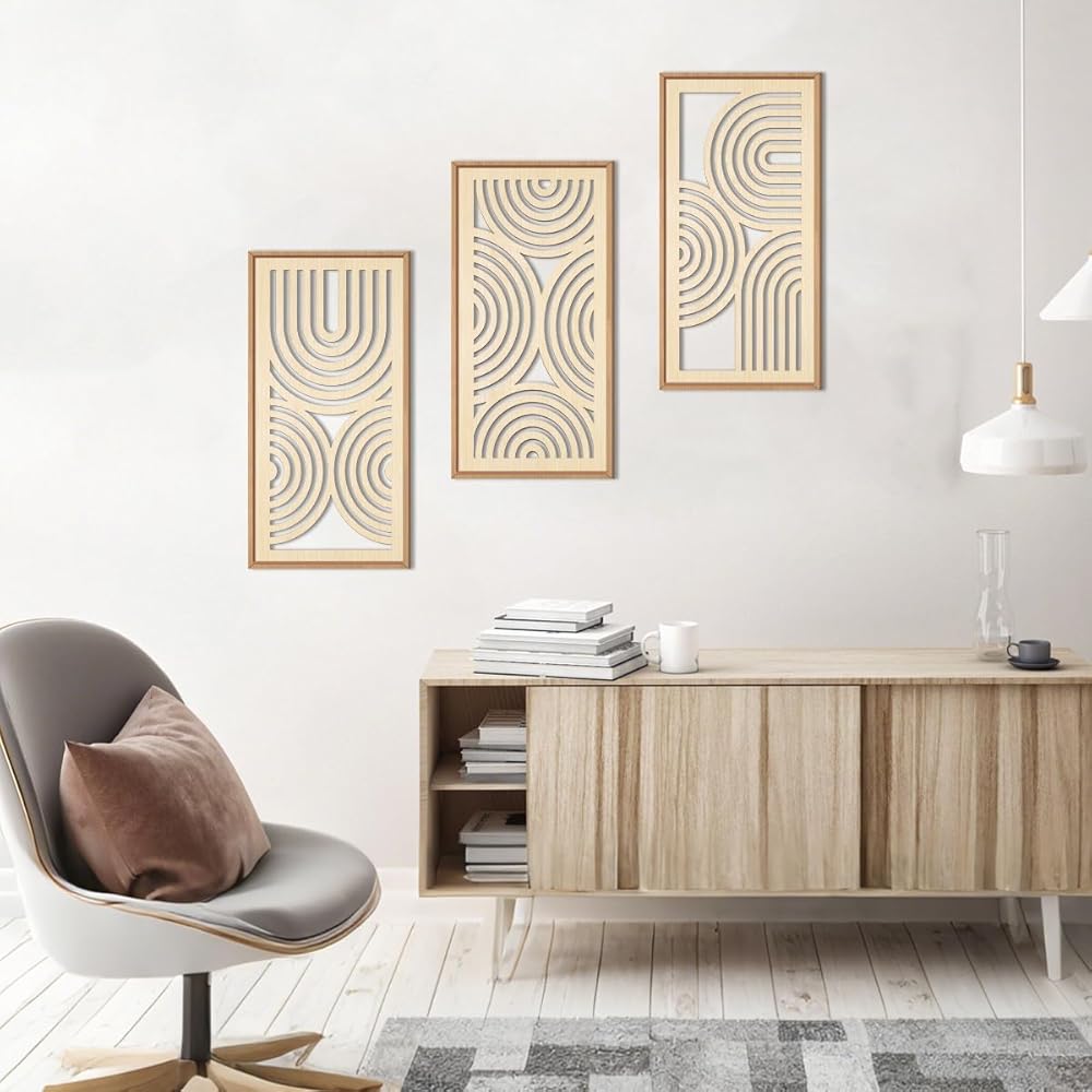 Boho Minimalist Wooden Wall Art Set: This set of three framed artworks showcases a unique boho-minimalist abstract design, featuring laser-engraved hollow-out details and geometric circular patterns, adding a stylish and artistic charm to any space.