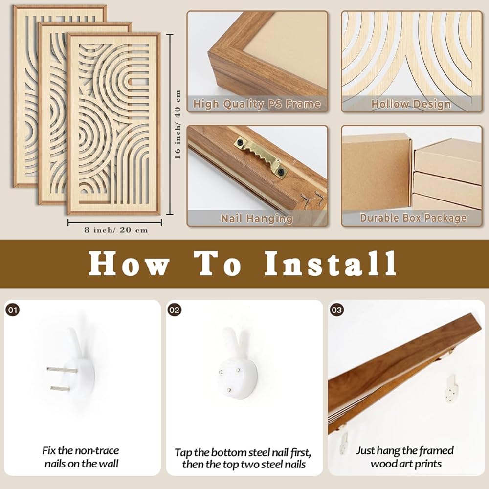 IARTTOP Boho Wooden Framed Wall Art Set of 3 Mid-century Modern Wood Wall Decor Minimalist Natural Bohemian Home Decor for Living Room Dining room Office