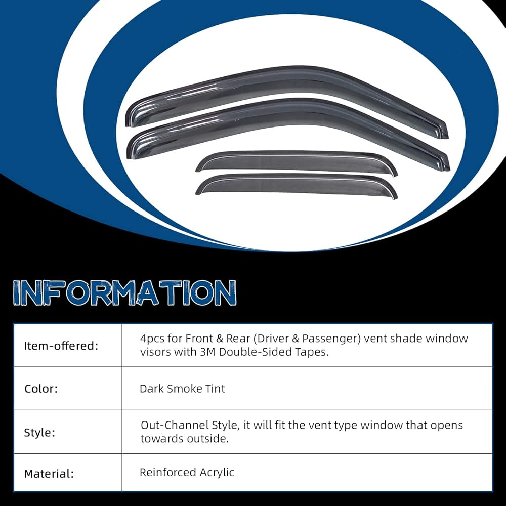 Item-offered:4pcs for Front & Rear (Driver & Passenger) vent shade window visors with 3M Double-Sided Tapes.