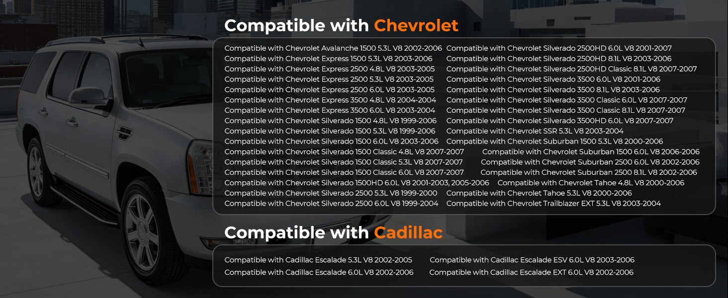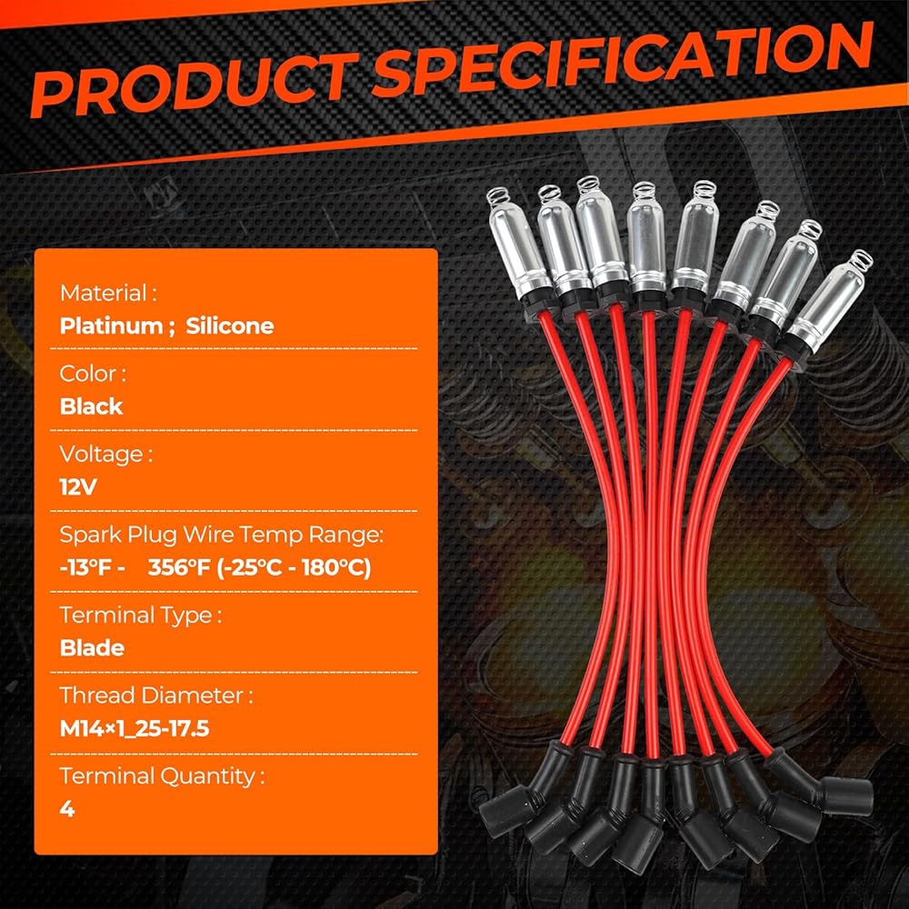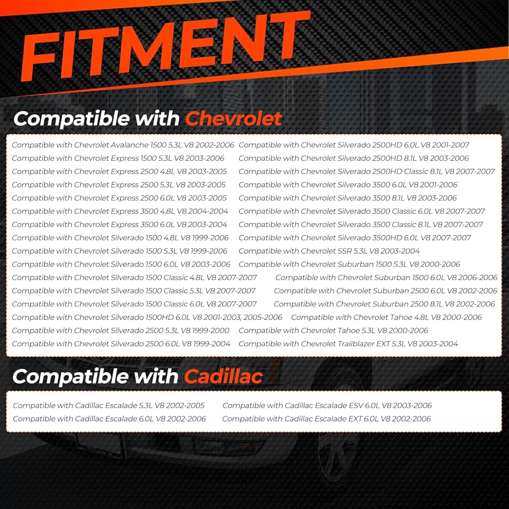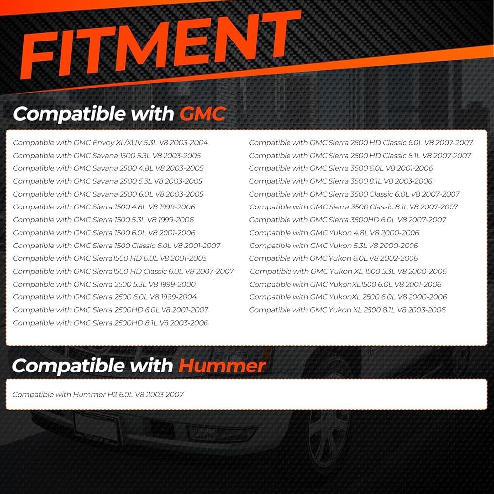 [Fitment] This square ignition coil with platinum spark plug and wire set are compatible with Cadillac Escalade 2002 - 2006; Compatible with Chevrolet Avalanche 1500/2500 2003-2006, Express 1500/2500/3500 2003-2006, Monte Carlo 1999-2006, Silverado 1999-2007, Sonora 2003-2004, Ssr 2000-2006, Suburban 2000-2006, tahoe/ trailblazer 2003-2004; Compatible with Gmc Envoy 2003-2005, Savana 1999-2007, Sierra 1999-2007, Yukon 2000-2007; Compatible with Hummer H2 2001 - 2007; Compatible with Mercruiser All Models 2004 - 2005; Compatible with Workhorse Fastrack Ft1061/Ft1261/Ft1461/Ft1801/Ft1601 2004-2005.