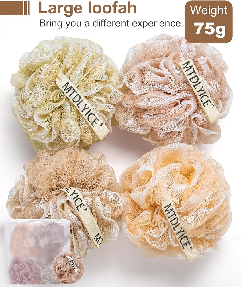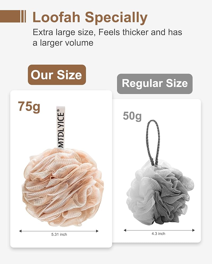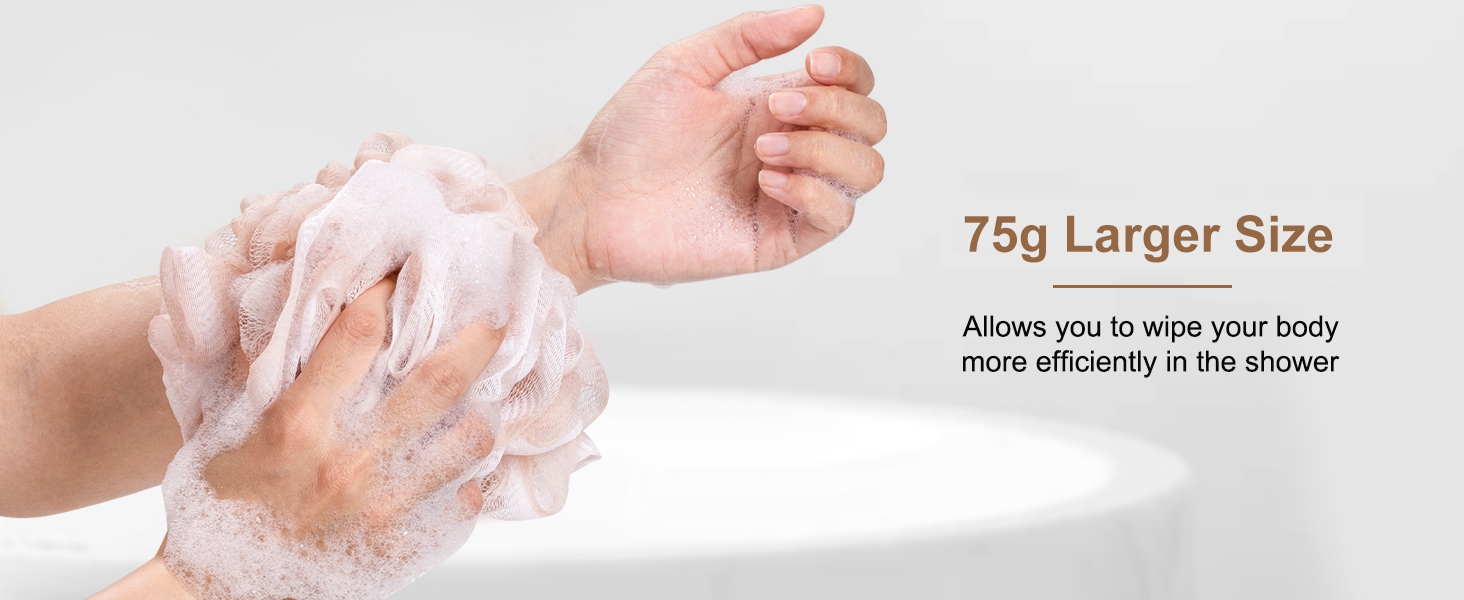 75g Large Loofah: larger size and density, easier to generate foam, greatly increased contact area with the body, cleaning efficiency significantly increased, relaxing exfoliation, gentle skin