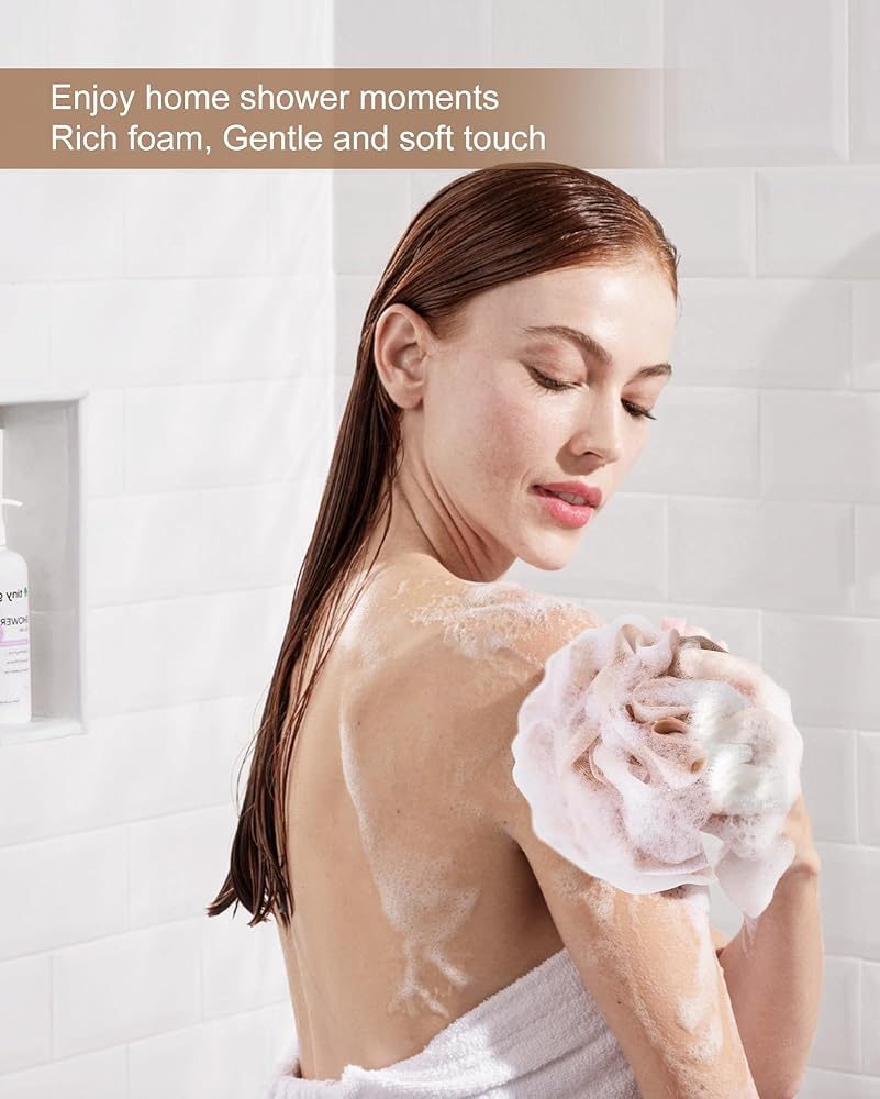 Home Shower Kits: Pink and beige mixed with white edges of the color scheme, the color is charming, good texture, make the shower more pleasant to use, suitable for different members of the family to use, pick their own exclusive that bath ball, soft mesh material, exfoliating shower good helper