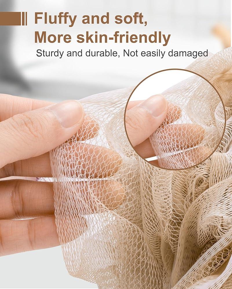 Stylish Design for Bathing Loofah: Highly efficient design. The enlarged size makes it easier to hold. The large wiping area makes it easy to apply foam to the body. It can easily remove dead skin cells from any part of the body. The beige texture is easy to clean and is strong and durable.