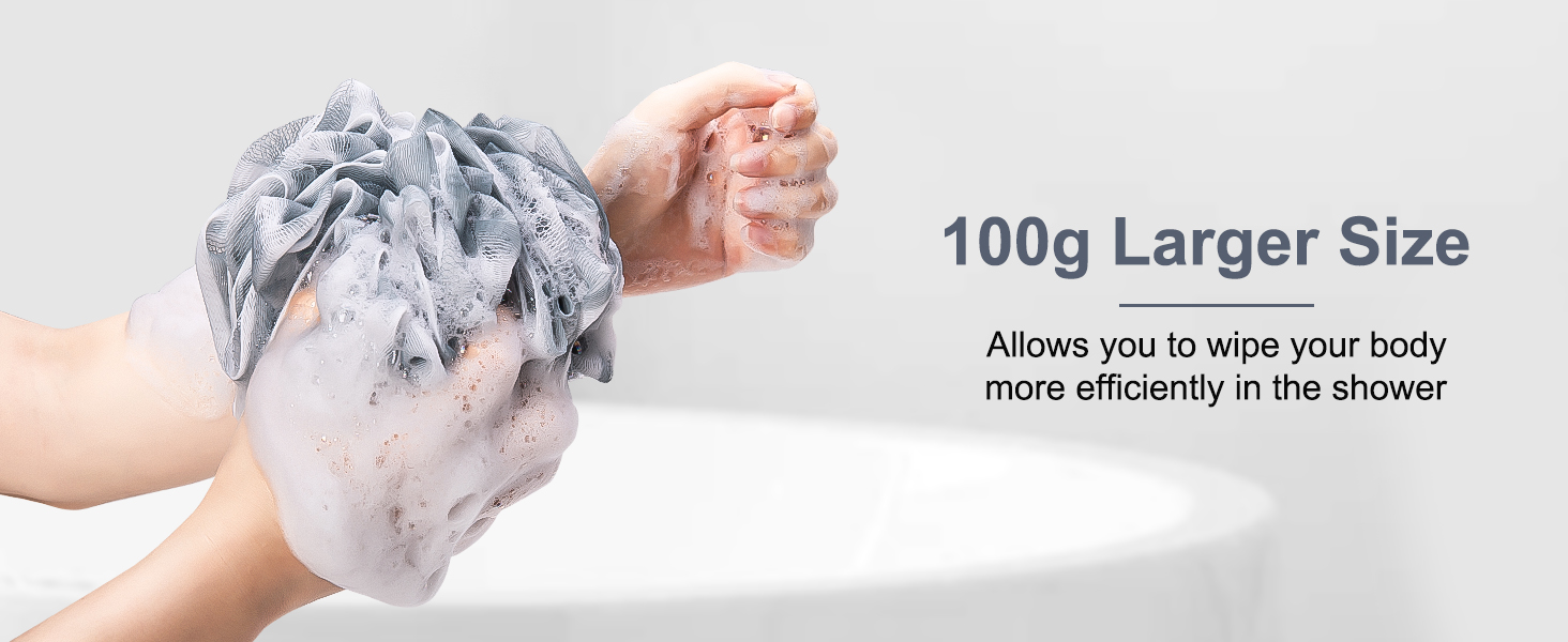 100g Extra Large Loofah: larger size and density, easier to generate foam, greatly increased contact area with the body, cleaning efficiency significantly increased, relaxing exfoliation, gentle skin