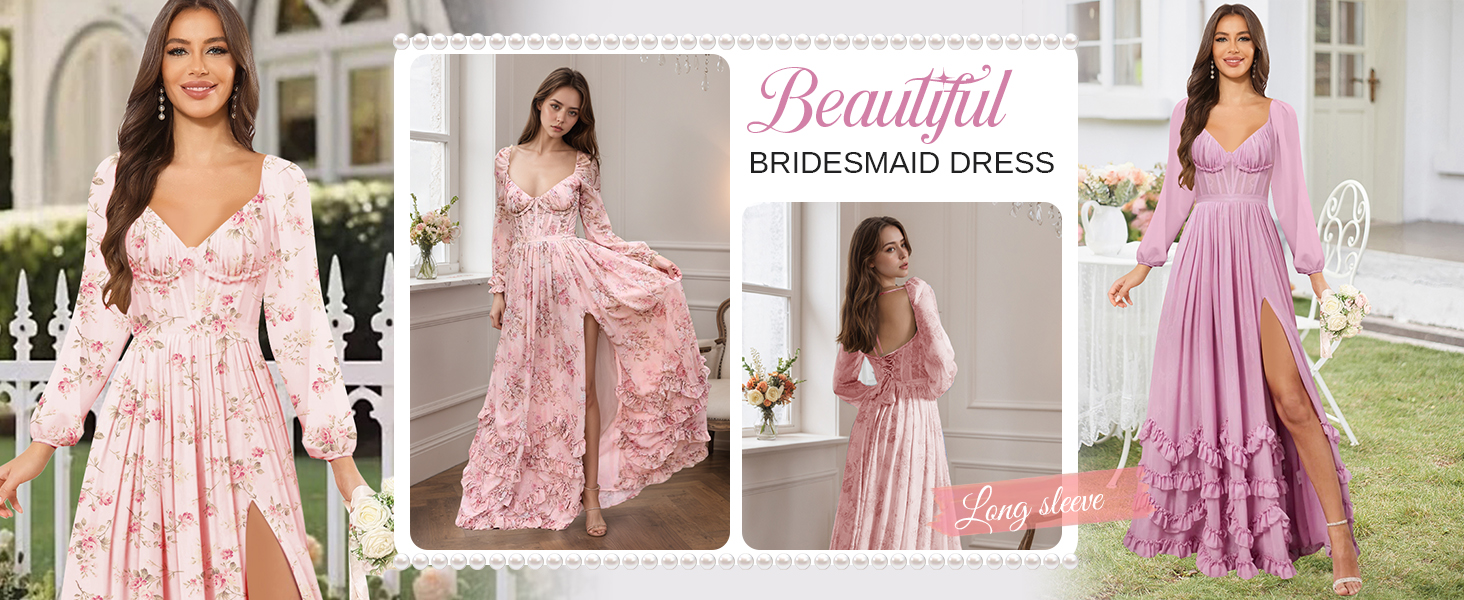 Features:Long Sleeves A-line Bridesmaid Dresses for Women with Slit 2025, Flowy Chiffon Wedding Guest Dress, Plus Size Long Bridesmaid Dresses, Ruffles Corset Formal Evening Dresses for Women Formal Gowns, V Neck Maid of Honor Dress
