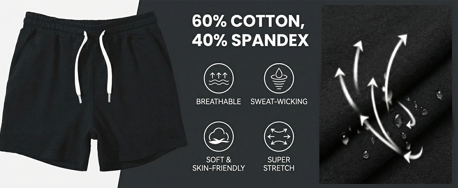 Premium Comfort & Performance Fabric: Experience all-day comfort that performs. Made from a 60% Cotton and 40% Spandex blend, these sweat shorts men feature a soft, moisture-wicking terry interior that keeps you dry and comfortable. The fabric is breathable, lightweight, and incredibly flexible, providing the perfect balance of cozy cotton feel and athletic performance stretch for any activity