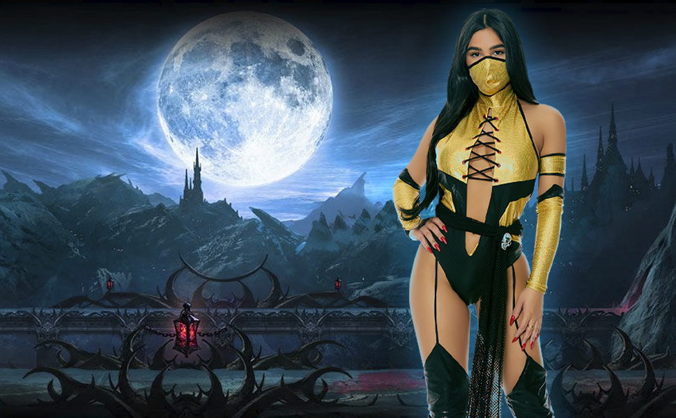 The Player One Sexy Videogame Character Costume is a 5-piece sexy women's Halloween costume that features metallic foil mock neck bodysuit with cutout panels and lace-up detail paired with matching sleeves and a mesh waistbelt with skull adornment along with an armband and facemask.