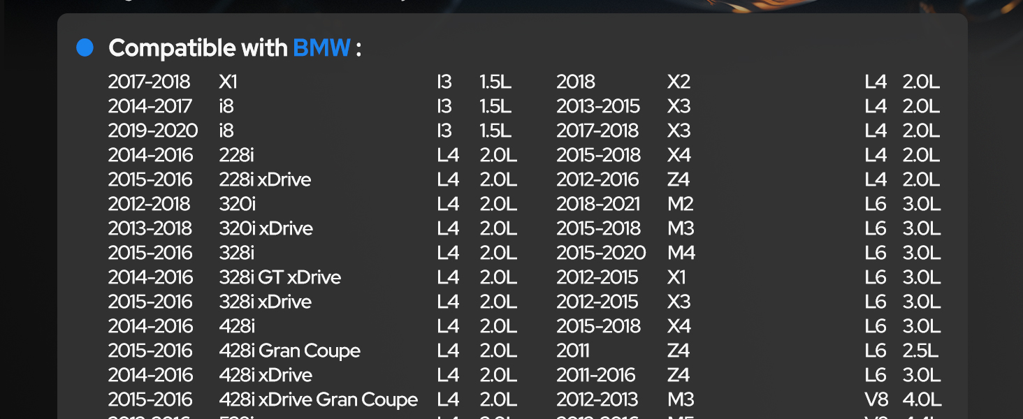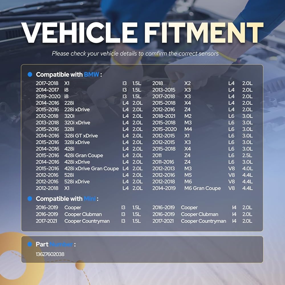 Vehicle Fitment-2: Mass Air Flow Sensor Compatible with BMW Z4 2012-2016 L4 2.0L, Z4 2011 L6 2.5L, Z4 2011-2016 L6 3.0L, X2 2018 L4 2.0L, i8 2014-2017 I3 1.5L, i8 2019 2020 I3 1.5L, M3 2015-2018 L6 3.0L, M3 2012 2013 V8 4.0L, M4 2015-2020 L6 3.0L, M2 2018-2021 L6 3.0L, M5 2012-2016 V8 4.4L, M6 2012-2018 V8 4.4L, M6 Gran Coupe 2014-2019 V8 4.4L. Compatible with Mini Cooper 2016-2019 I3 1.5L, Cooper 2016-2019 L4 2.0L, Cooper Countryman 2017-2021 I3 1.5L, Cooper Countryman 2017-2021 L4 2.0L, Cooper Clubman 2016-2019 I3 1.5L, Cooper Clubman 2016-2019 L4 2.0L