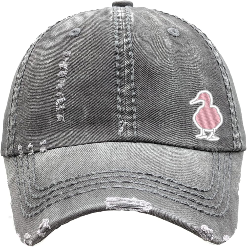 Women's distressed, 100 percent cotton, embroidered duck baseball cap or high ponytail cap. Your choice of cap color and duck thread color. Ladies fit, mesh-free cap with matching faux leather, adjustable back buckle. All caps have Distinct Headwear branding inside the cap crown. Handmade in the US - made to order.
