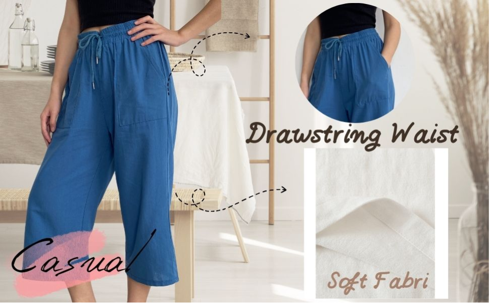 Feature: Cotton linen pants for women, tapered pants, ninth pants, high waist, drawstring, solid color, loose comfortable fit, two side pockets. wide leg, lounge wear, capris petite. Suitable to wear for spring and summer and fall.