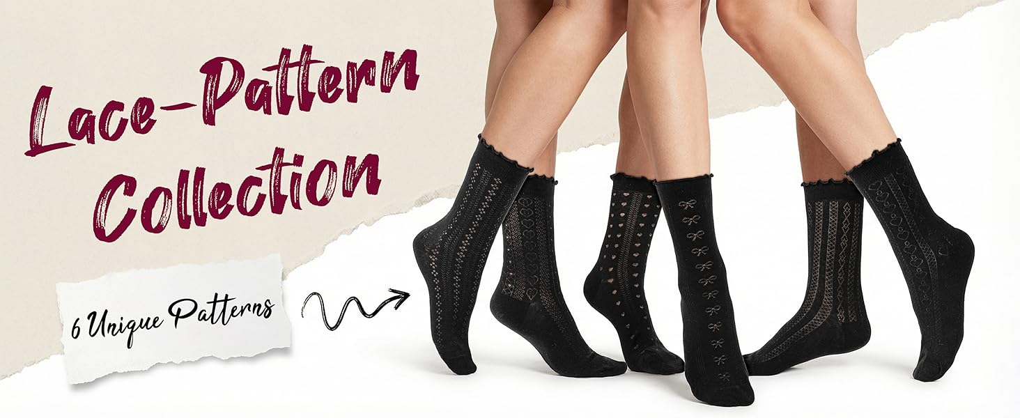 【DURABLE & EASY CARE】Designed for daily wear, our mesh socks retain their shape and delicate lace texture after washing. Machine washable in cold water (laundry bag recommended). Each pack includes 6 pairs of classic black frilly socks to refresh your weekly wardrobe.