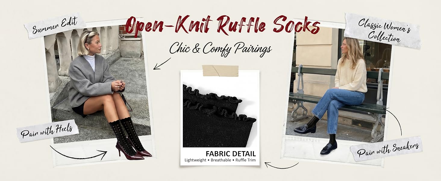 【THIN & ELEGANT DESIGN】Tired of bulky socks ruining your look? Our mesh ruffle socks feature a sophisticated "lotus leaf" frilly edge and delicate mesh lace in classic black, delivering a refined, non-childish aesthetic. Perfect for Gen Z and modern women who love vintage elegance with a cool, urban twist.