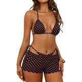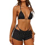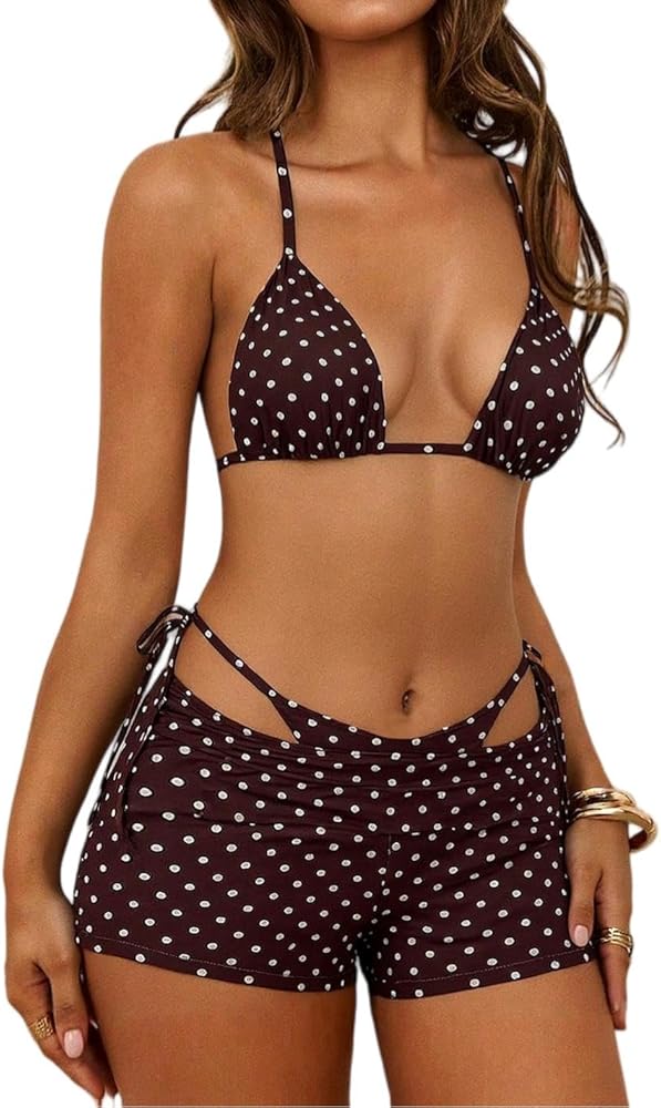 Features: 3 piece swimsuit with cover-up, Y2K retro style, halter-neck bikini top, side-tie bottoms, and cover-up shorts.