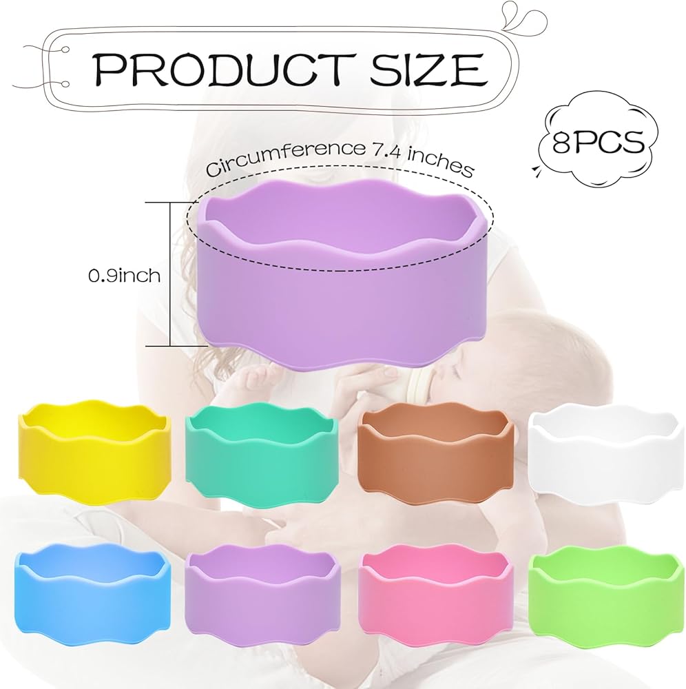 Keep your child's bottles organized and avoid mix-ups with our 8 Pack Silicone daycare bottle labels! Designed for durability and convenience, these stretchable water bottle name tag fit most standard bottles (7-9" circumference) and stay securely in place once applied. The set includes 8 vibrant colors—white, blue, cyan, purple, brown, pink, yellow, and green—so every kid can pick their favorite.