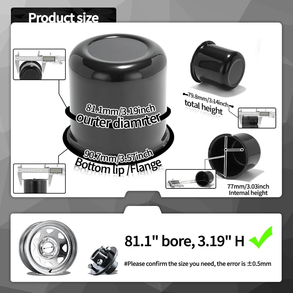 Size: 3.19 inches diameter, 3.14 inches height, total measurement across the back of the flange is 3.57 inches. Please use a digital caliper to check the center bore size if you are not sure. For the models with the diameter of the wheel center hub cover parameters errors are within 0.5 mm for the success of fitment.