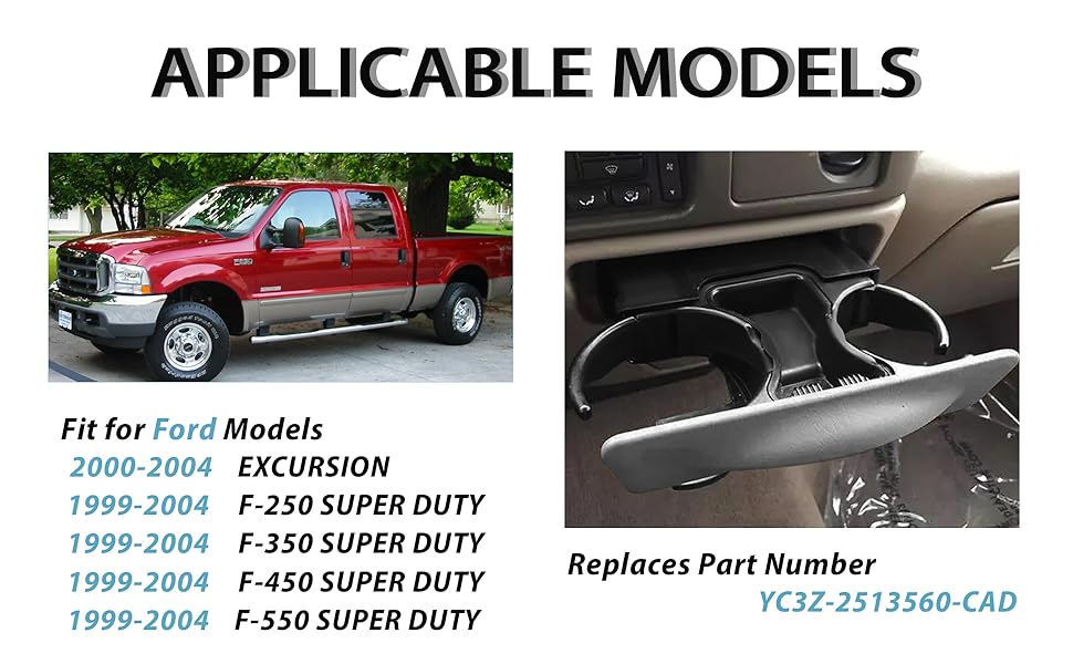 【Vehicle Fitment】Direct replacement, this in-dash cup holder ihnsert perfect fit for 2000-2001 Ford Excursion 10 Cyl 6.8L, 8 Cyl 5.4L, 8 Cyl 7.3L Diesel Turbo; 1999-2001 Ford F-250 Super Duty 10 Cyl 6.8L, 8 Cyl 5.4L, 8 Cyl 7.3L Diesel Turbo; 1999-2001 Ford F-350 Super Duty 10 Cyl 6.8L, 8 Cyl 5.4L, 8 Cyl 7.3L Diesel Turbo; 1999-2001 Ford F-450 Super Duty 10 Cyl 6.8L, 8 Cyl 7.3L Diesel Turbo; 1999-2001 Ford F-550 Super Duty 10 Cyl 6.8L, 8 Cyl 7.3L Diesel Turbo. Please confirm compatibility before purchasing!