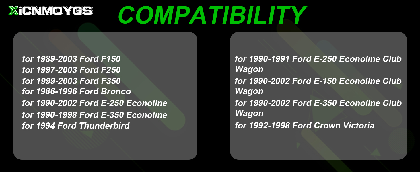 [Compatibility 1] ---- Compatible for 1989-2003 Ford F150, for 1997-2003 Ford F250, for 1999-2003 Ford F350, for 1986-1996 Ford Bronco, for 1990-2002 Ford E-250 Econoline, for 1990-1998 Ford E-350 Econoline, for 1990-1991 Ford E-250 Econoline Club Wagon, for 1990-2002 Ford E-150 Econoline Club Wagon, for 1990-2002 Ford E-350 Econoline Club Wagon, for 1992-1998 Ford Crown Victoria, for 1994 Ford Thunderbird.
