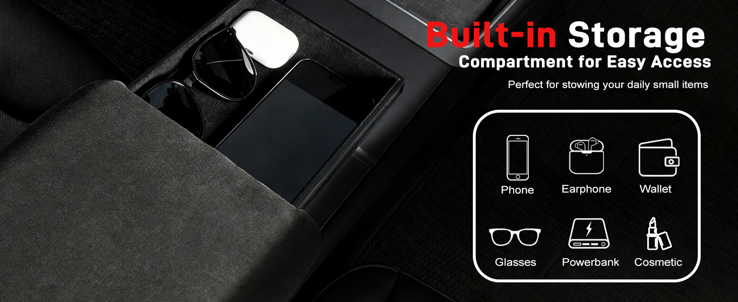 【Built-in Storage Box】Crafted from premium Suede Fleece, our tesla model y center console cover and Tesla interior accessories center console cover protects your original armrest from scratches, stains, and daily wear. The added built-in storage box keeps small items (cards, keys, USB drives) organized—perfect for busy commuters and families. A durable, functional armrest console cover for long-term use
