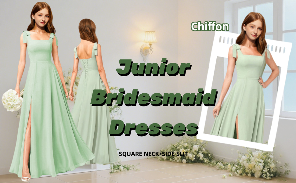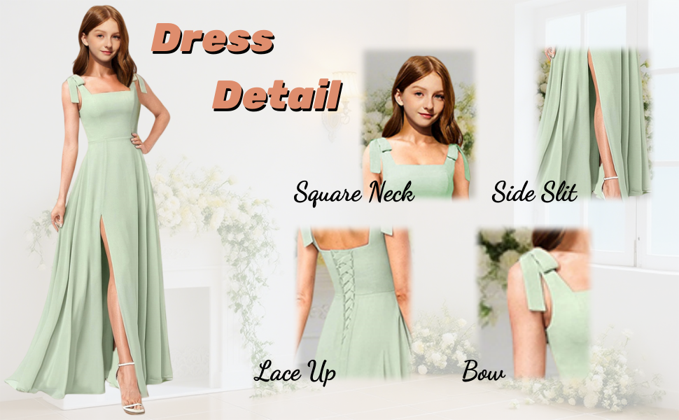 Feature: Square Neck Junior Bridesmaid Dresses, Chiffon Girls Bridesmaid Dresses A-Line, Spaghetti Straps Flower Girl Dress for Teen Girls with Detachable Bow Wedding Guest Formal Dress with Slit