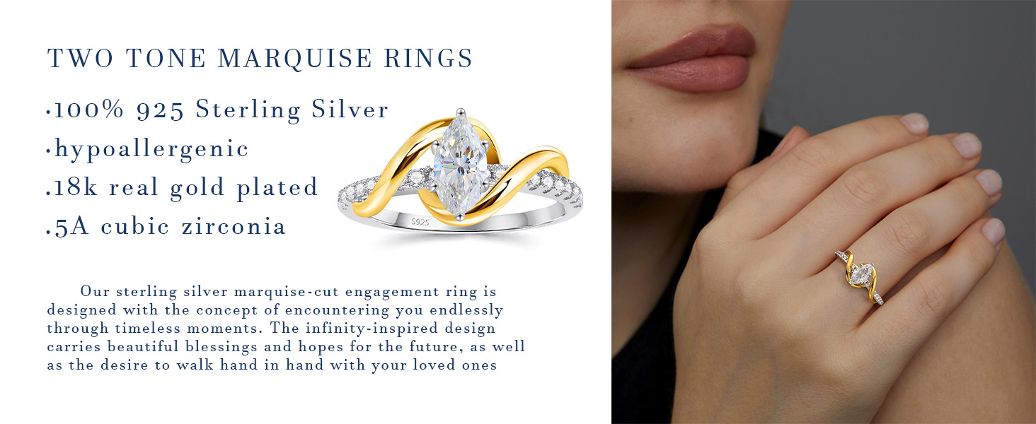 Sterling Silver Two-Tone Marquise Engagement Ring: This elegant two-tone marquise engagement ring features a timeless ribbon design and a two-tone style, giving the ring a delicate and graceful appearance. The combination of gold and silver creates a striking charm, while the infinite knot design ensures the ring's shape remains timeless, classic, and visually appealing. A 0.5CT marquise stone in the center adds a refined touch, making the ring even more exquisite