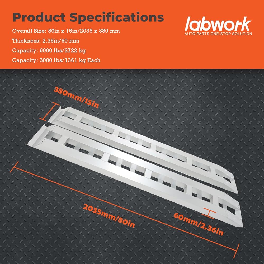 Features: Max. 6000 Lbs Load Bearing: Item Size: 80 x 15 inch. The single ramp can hold up to 3000 lbs (6000 lbs for two)