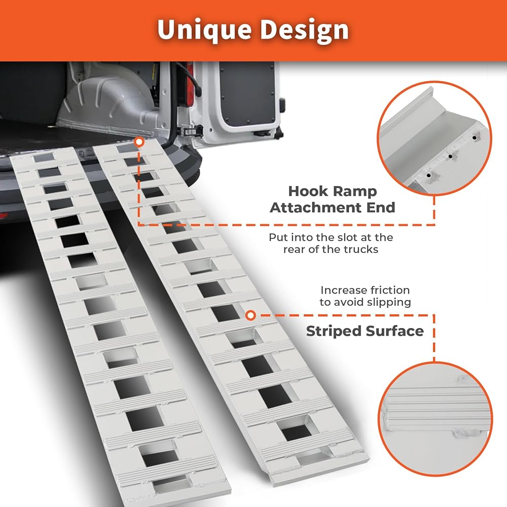 Lightweight and High-strength: Made of Aluminum material, Lighter than steel ramps, loading pickup trucks, Atvs, Utvs, other load-bearing cars,A single ramp can be used for dirt bikes, bicycles, or motorcycles, while a pair of work for tractors, snow blowers, ATVs, or whatever else you need to load into your truck bed