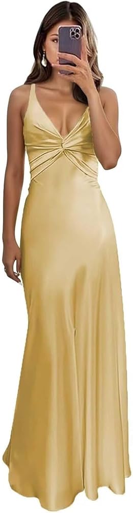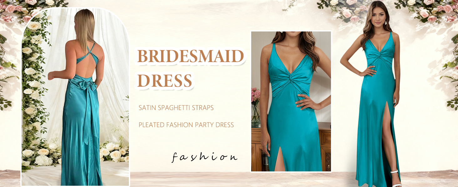 Feature: Silk Satin Bridesmaid Dress, V-Neck, Spaghetti Straps, Cross Pleated, Sleeveless, Mermaid, Corset Waist, Open Up Back, Floor Length, High Slit, Long Dress for Women
