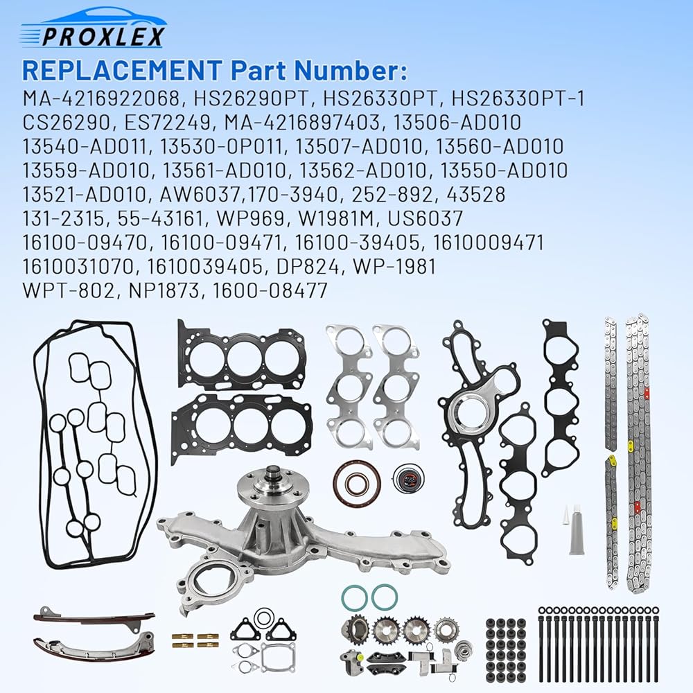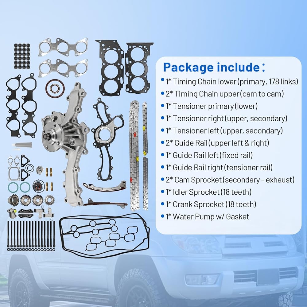 【Package Include】: 1 Set of Timing chain kit, 1 Set of Water Pump Kit, 1 Set of Full Gasket Set Head Bolts.