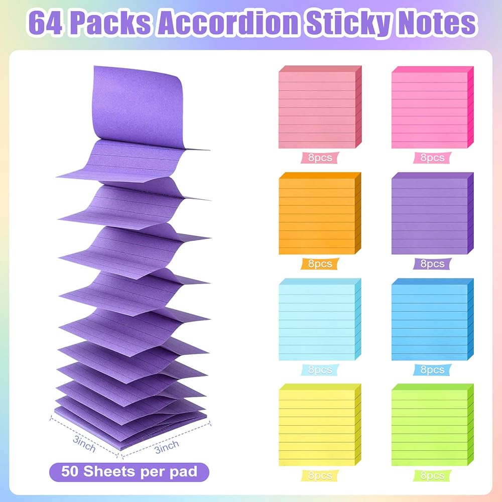 64 Pads Pop Up Sticky Notes Accordion Sticky Notes 3x3 Refills Lined 8 Bright Color Post Stickies Bulk Sticky Note with Lines Colorful Popup Notes for Dispenser, Home, Office, School, Meeting, Work