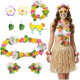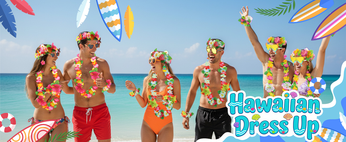 Hawaiian Style Design: Each Hawaiian costume accessory set features tropical flowers as its main theme, combined with elements such as tropical orchids, hibiscus, coconuts, flamingos, and pineapples, creating a fresh yet vibrant summer island style. Common color combinations such as pink, yellow, orange, and purple are perfect for summer beach parties, hula dance parties, vacation photoshoots, and other occasions