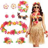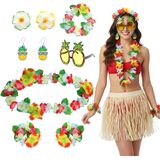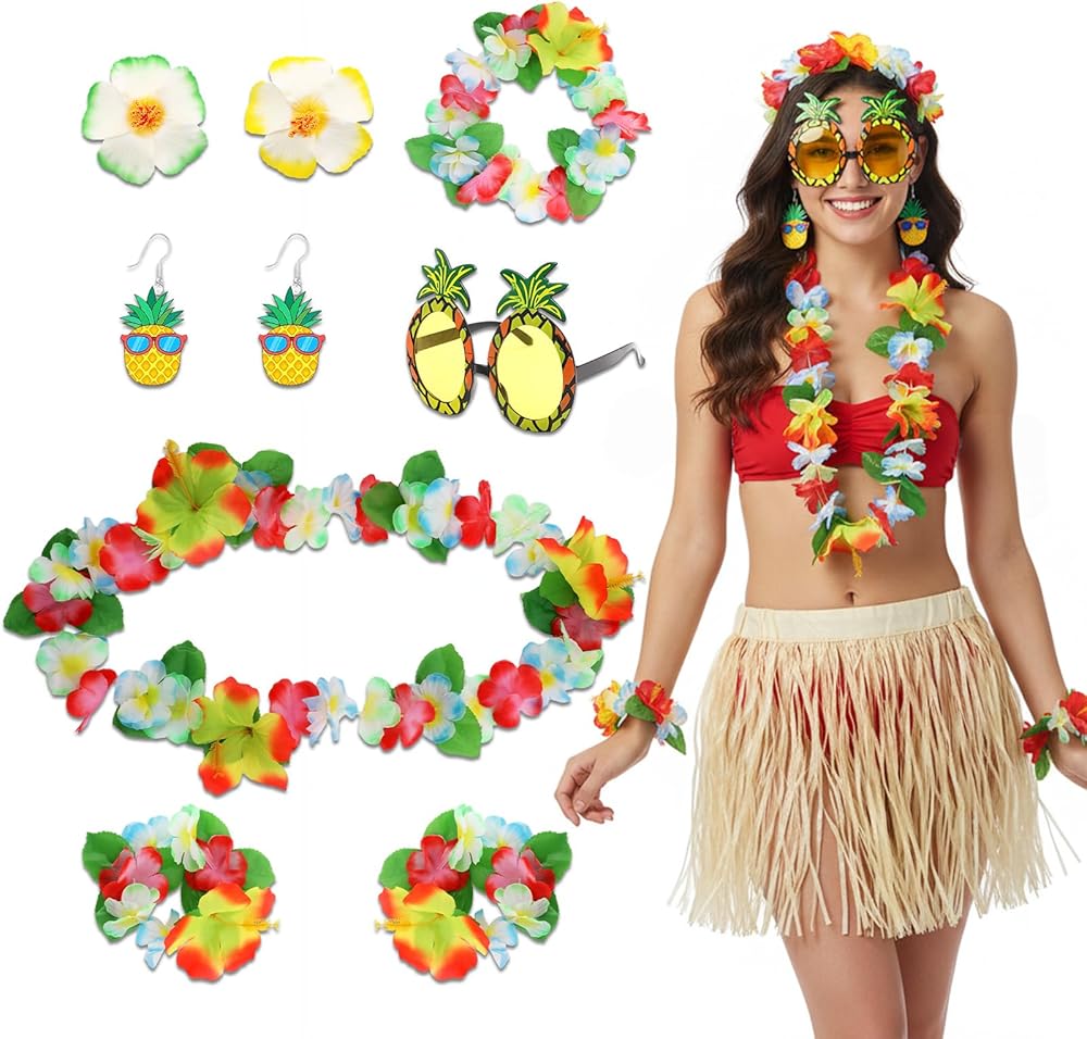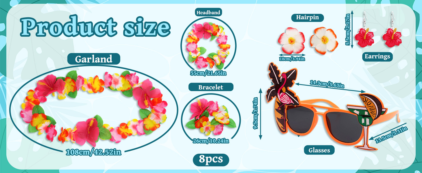 Hawaiian Costume Accessory Set: This Hawaiian costume accessory set includes 8 accessories: 1 Hawaiian floral crown, 1 tropical leis wreath, 2 hibiscus flower hair clips, 2 Hawaiian-style earrings, 2 bracelets, and a pair of sunglasses. These can be worn or used as decoration. Each accessory features a unique color scheme, exuding tropical flair, making them the perfect decoration for summer parties