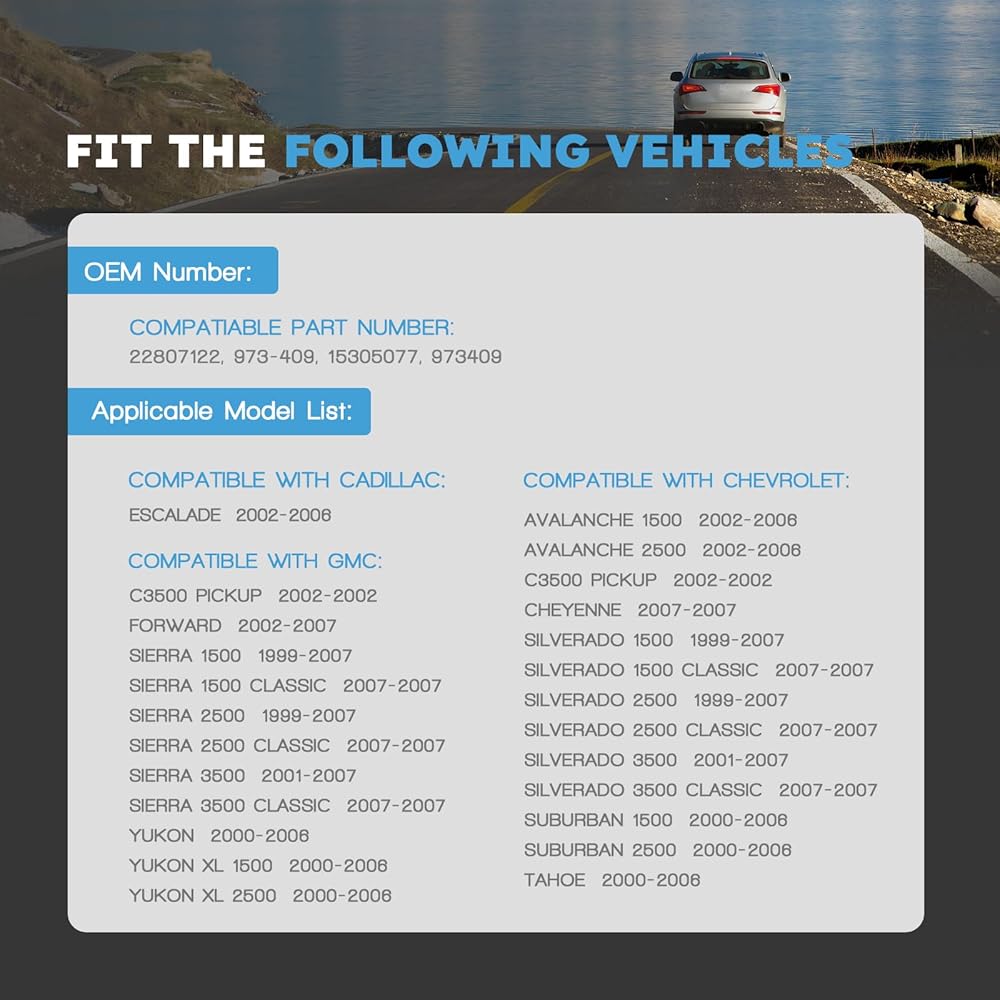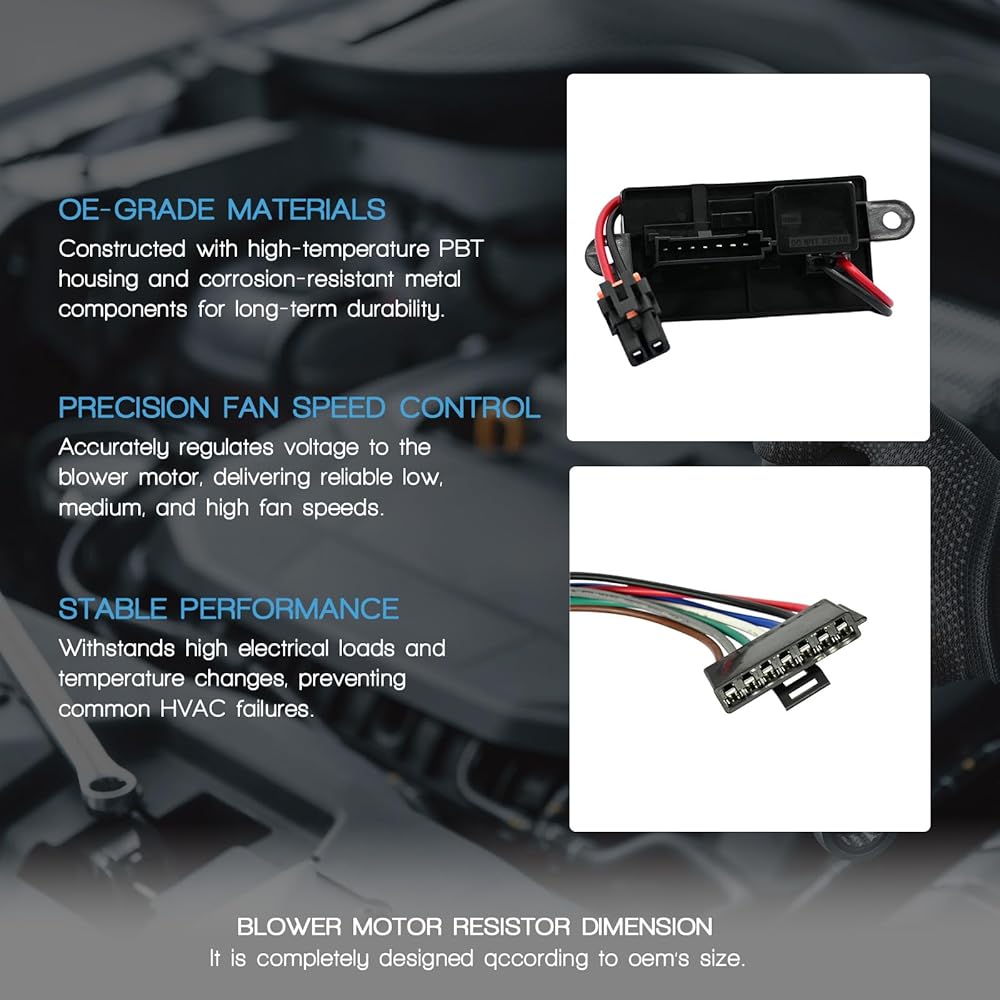 【Fitment】: HVAC Blower Motor Resistor fit for Cadillac Escalade 2002-2006; Fit for Chevrolet Avalanche 1500 2500 2002-2006, C3500 Pickup 2002-2002, Cheyenne 2007-2007, Silverado 1500 2500 1999-2007, Silverado 1500 2500 3500Classic 2007-2007, Silverado 3500 2001-2007, Suburban 1500 2500 2000-2006, Tahoe 2000-2006; Fit for GMC Sierra 1500 2500 1999-2007, Sierra 1500 2500 3500 Classic 2007-2007, Sierra 2500 Classic 2007-2007, Sierra 3500 2001-2007, Yukon 2000-2006, Yukon Xl 1500 2500 2000-2006【Replace Part Number】: HVAC Blower Control Module Replaces# 22807122, 973-409, 15305077, 973409 --- Before purchasing this HVAC fan motor resistor, please enter your vehicle【High Quality Materials】: This air conditioning blower motor resistor is made of durable copper interface and aluminum column, which has the advantages of impact resistance, heat resistance, and aging resistance. It can prevent poor connection, prevent excessive current from burning out the blower, ensure efficient operation, and extend service life.【Function】: The blower motor resistor controls the fan speed of the blower motor by changing the resistance. If your blower motor is stuck at a certain speed and the fan does not work under certain settings, the vehicle ventilation port will not blow air. This blower motor resistor can perfectly solve this problem.【Package Includes】:1 X HVAC Blower Motor Resistor, 1 X AC Blower Control Module Wire Harness