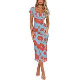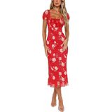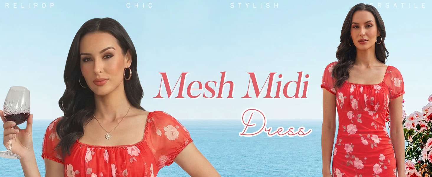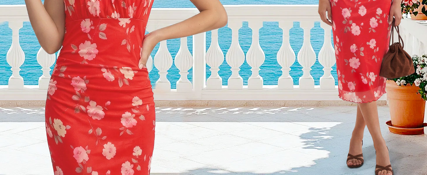【Material】95%polyester+5%spandex. S=US 4-6, M=US 8-10, L=US 12-14, XL=US 16-18, XXL=US 20-22. The floral midi dress is made with stretchy printed mesh fabric. Soft, skin-friendly and double lined, stylish yet comfortable for all-day wear. Suitable for spring, summer, fall and perfect for coastal areas with mild winter.
