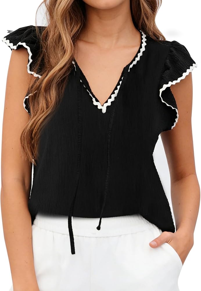 Experience the Perfect Blend of Elegance and Comfort Step into the season with confidence in Women Ric Rac Trim V Neck Blouse. This isn't just a basic tee; it's a carefully crafted fashion statement designed for the modern woman who values both style and functionality. Design That Speaks Volumes The first thing you'll notice is the exquisite contrast wavy trim. This vintage-inspired Ric Rac detail lines the neckline and the ruffle sleeves, creating a sophisticated silhouette that draws the eye. The fluttery cap sleeves provide just the right amount of coverage while allowing for maximum airflow, making it an essential for your summer rotation. Tailored for Your Lifestyle Are you a teacher looking for a modest yet trendy classroom outfit? Or a professional needing a seamless transition from morning meetings to evening dinners? This blouse fits the bill. The relaxed silhouette provides a flattering drape that complements all body types, ensuring you feel as good as you look. The 100% polyester fabric is the hero here—offering a soft-to-the-touch feel without the high maintenance of silk or linen. Style Tips & Care The Office Look: Tuck it into a high-waisted pencil skirt or tailored trousers and pair with loafers. The Weekend Look: Style it with distressed white denim shorts and straw bags for a boho-chic aesthetic. The Care: Simply toss it in the wash on a gentle cycle. Its wrinkle-resistant nature means you can grab it straight from the dryer and go.